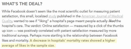 Notice how the Ragan article twisted the original phrase to make it seem as though the Facebook likes were a contributing factor to mortality rates, rather than a consequence of the increase or decrease in mortality rates.