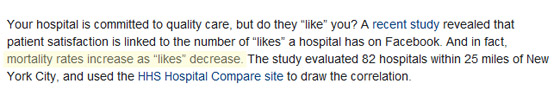 According to an article from Ragan’s Healthcare Communication News, a hospital’s Facebook likes have a direct correlation to the hospital’s mortality rates, and worse, might even be a contributor to the increase in mortality rates. Say what?